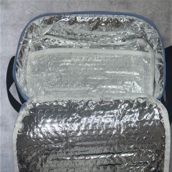 25x18x9 cm, tiene aislante térmico y un bolsillo en su interior. Correa regulable.