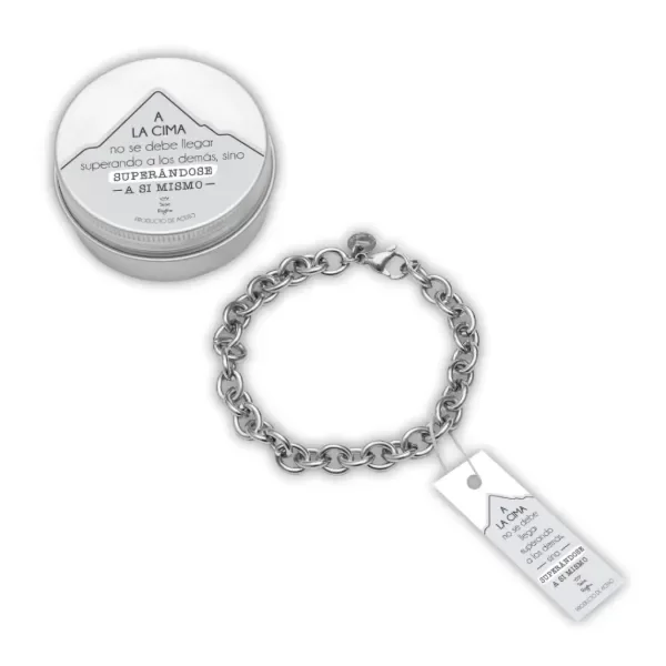 Pulsera de cadena de acero con diseño minimalista y mucha personalidad. Es ese toque distintivo que eleva cualquier look del día a día. Viene presentada en una práctica lata reutilizable con un sticker original diseñado especialmente para este producto. ¿Lo mejor? Al estar hecha de acero, un material súper resistente y duradero, es un regalo para siempre.